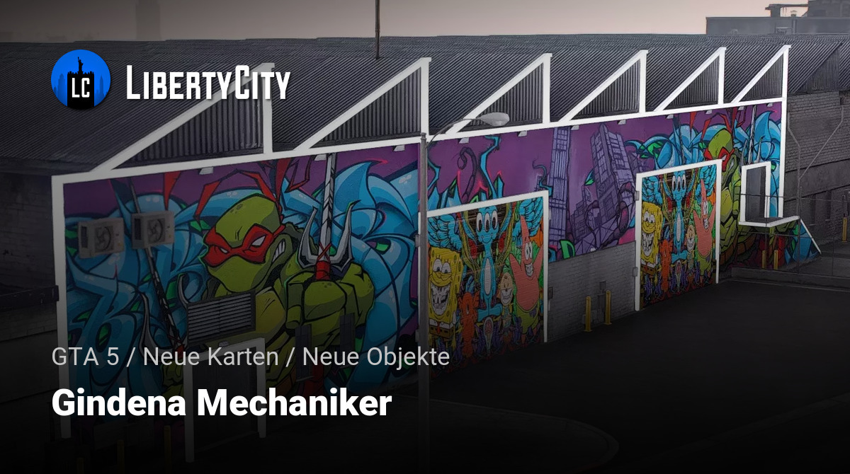 Das äußere Erscheinungsbild von Gindena Mechaniker ist ein großes Industriegebäude mit einem grauen Metalldach und Backsteinwänden. Das Hauptmerkmal der Fassade ist ein helles und großflächiges Graffiti, das die gesamte Vorderwand bedeckt. Auf dem Graffiti sind bekannte Figuren der Popkultur abgebildet: eine Ninja-Schildkröte mit rotem Band, SpongeBob, Patrick, der Cartoon-Kater und andere Zeichentrickhelden. Das Bild ist in satten, kontrastreichen Farben gehalten, was das Gebäude sehr auffällig und erkennbar macht. Die Konturen des Gebäudes und der Türen sind mit weißen leuchtenden Linien hervorgehoben, was einen modernen und stilvollen Akzent setzt. Insgesamt wirkt das äußere Erscheinungsbild der Werkstatt kreativ, jugendlich und zieht durch sein einzigartiges Design die Aufmerksamkeit auf sich.