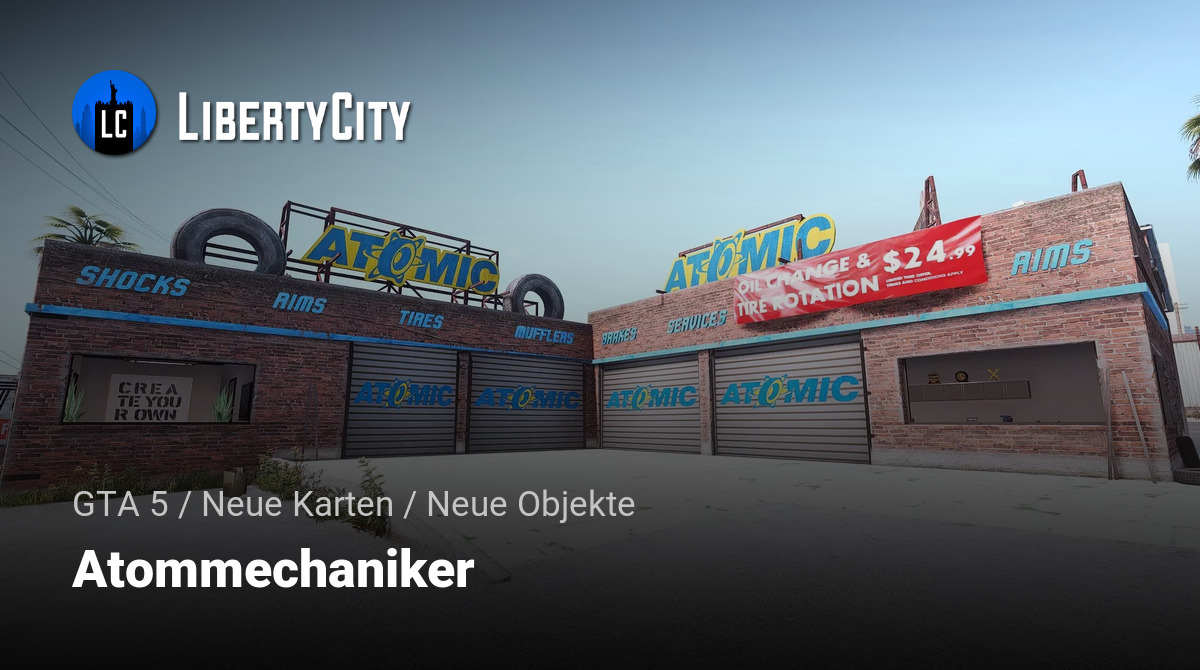 Die Autowerkstatt Atomic Mechanic ist ein Backsteingebäude mit mehreren grauen Garagentoren, die mit leuchtend blauen Aufschriften "ATOMIC" verziert sind. Auf dem Dach befinden sich massive Schilder mit dem Atomic-Logo in gelb-blauen Farben sowie dekorative Autoreifen. An der Fassade des Gebäudes sind Schilder mit einer Liste der angebotenen Dienstleistungen angebracht: "STÖßE", "FELGEN", "REIFEN", "AUSPUFFANLAGEN", "SERVICE", "HAFTUNG". Rechts hängt ein großes rotes Banner mit Werbung für Ölwechsel und Reifenmontage. Vor dem Gebäude befindet sich ein geräumiger, sauberer Platz, umgeben von niedrigem Grün und Palmen. Die Atmosphäre ist typisch für kalifornische Autowerkstätten: hell, sauber und modern.