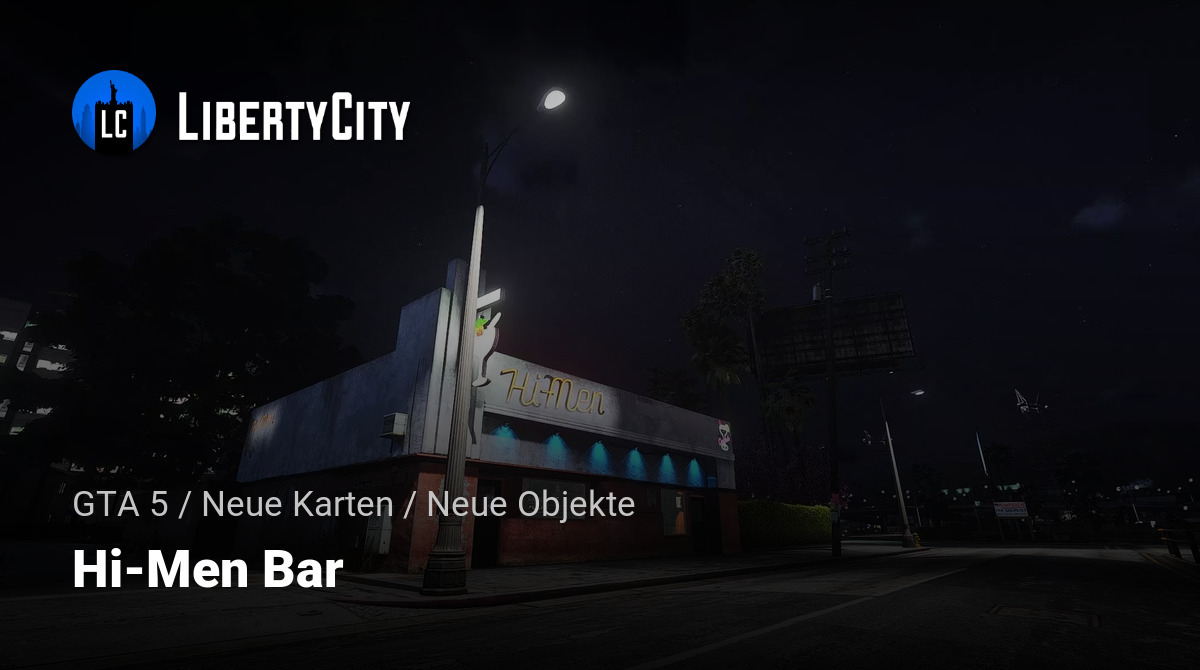 Der Hi-Men Bar ist ein einstöckiges Gebäude in rechteckiger Form mit einem flachen Dach. Der untere Teil der Fassade ist dunkelrot gestrichen, während der obere Teil hellblau ist. An der Fassade befindet sich ein Neon-Schild mit der Aufschrift "HiMen" und einer stilisierten Darstellung einer männlichen Figur. Rund um das Gebäude sind blaue Neonlampen installiert, die nachts ein helles Licht erzeugen. Die Fenster sind klein und mit Gittern geschützt. Die Eingangstür befindet sich an der Seite, nahe der Ecke des Gebäudes. Das Gebäude steht an einer Straßenecke, in der Nähe eines Laternenpfahls. Drumherum gibt es asphaltierte Gehwege und Straßen sowie spärliche Vegetation und Straßenbüsche. Nachts wirkt die Bar dank der Neon-Elemente und der Straßenbeleuchtung hell und auffällig.