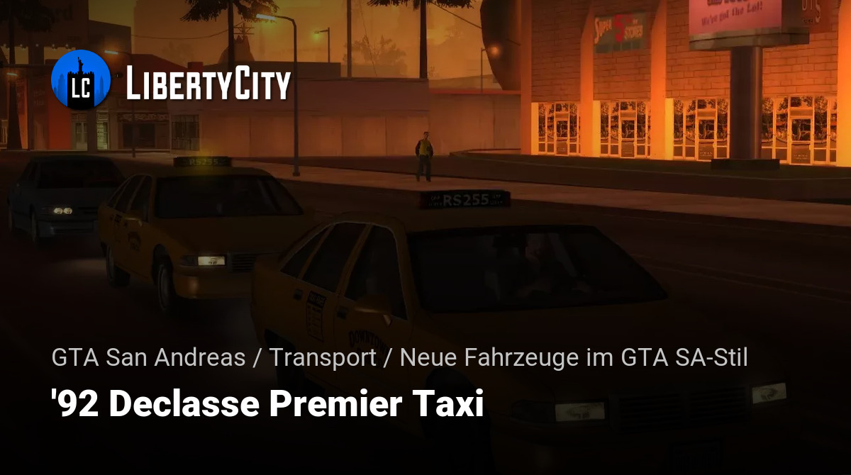 Dies ist ein lore-freundliches Taxi , das auf der zivilen Version des Declasse Premier ’92 basiert. Das Modell fügt sich harmonisch in die Atmosphäre der Straßen von San Andreas ein und spiegelt den Stil der Taxis der frühen 90er Jahre wider.